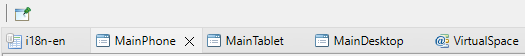 All menu bars and toolbars are context sensitive to the selected Tab. When you start the IIZI Workspace, a Panel Editor is already open for each main Panel, along with a Text table Editor open for a Text table, and a Virtualspace Editor open for a virtualspace; all these are created when starting with iiziGo Quickstart.