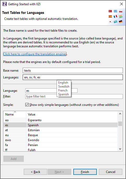 Project name.Phone, Tablet, Desktop.Create text tables with automatic translation.typing in the language code or by filtering the languages and click Add. The first language specified is the base language, i.e. the language you intend to use when you develop the application. When you use automatic translation, English (en) is recommended as Google Translate or Microsoft Azure Cognitive Service to translation gives the best result as it translates accurately. See Automatic text table translation for more information.Finish and you’re ready to go!Project Manager and choose New > Project.IIZI, choose to create a new IIZI Module Project (Quickstart).