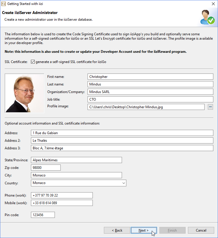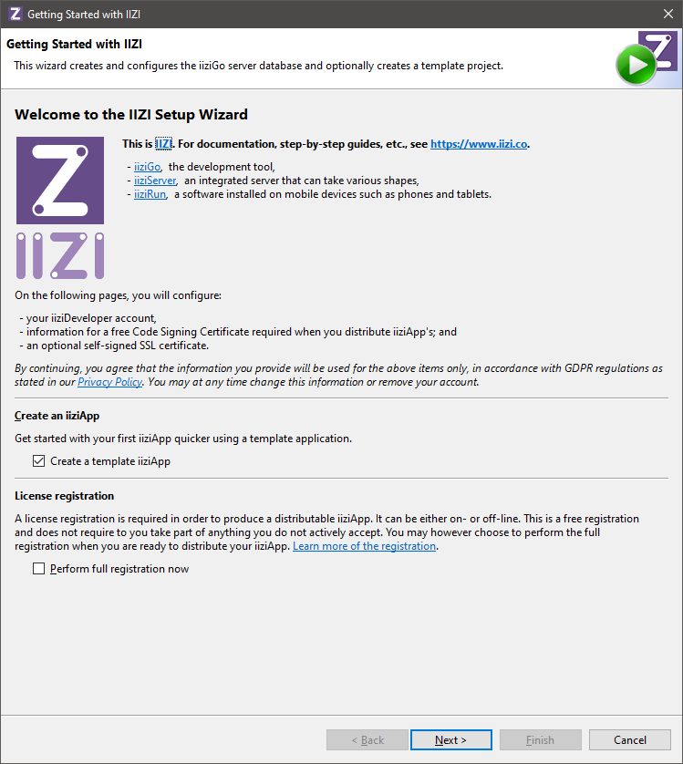 The important part of the wizard is the creation of the iiziDeveloper account with the Code Signing Certificate used when you distribute signed iiziApps.