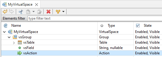 Name your VirtualSpace entities as you would variables and fields in Java code (for e.g. vsMyAction); a vs prefix will help keep your application organized and make VirtualSpace entities easily distinguishable from Java fields and UI Component names.