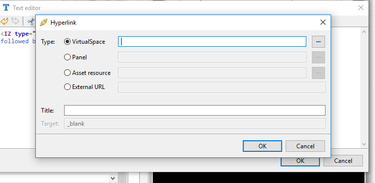 In the Text Editor toolbar, the Link to the Virtualspace entity tool, {V} will allow you to connect your current text to a new or existing vsField. Virtualspace references are not stored in the text table, but enable injection of a data directly into a text.