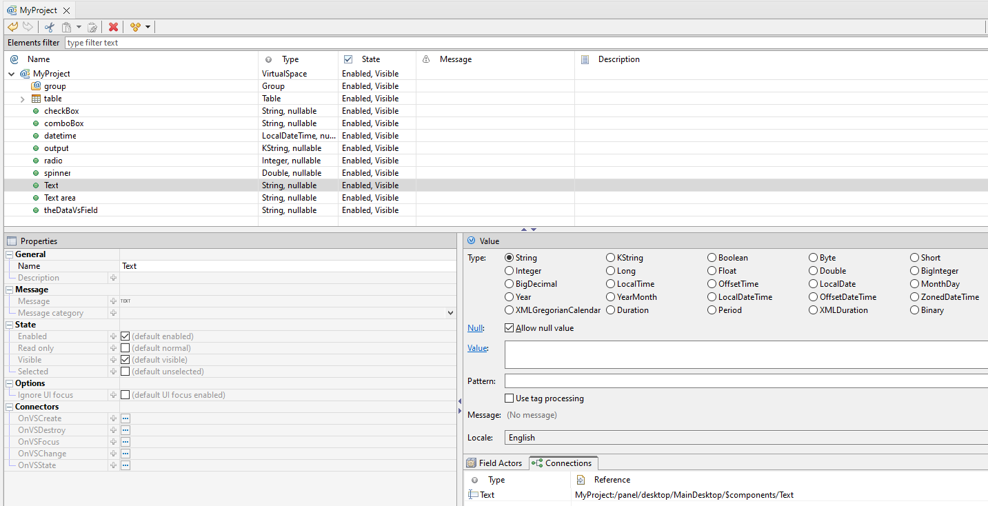 The properties shown in the VirtualSpace Editor depend on the selected VirtualSpace entity type – all VirtualSpace entities have the states Enabled, Read-only, Visible and Selected. By default, they are all Enabled and Visible, not Read-only and not Selected. The value of each VirtualSpace entities can be changed depending on the type of data in the editing pane at the bottom right – specialized for each component.